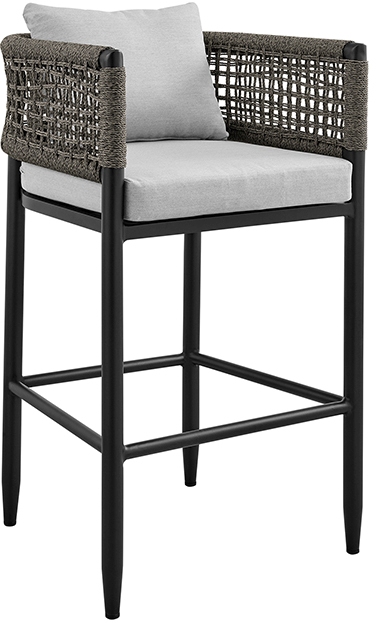 The rope is treated to be protected from water, UV, oil, and fading. The lightweight aluminum frame of this outdoor stool is easily portable and features a multi-layer powder coating for further effective protection from the elements and everyday wear and tear. The light grey cushions not only feature high density foam that will allow for many hours of comfortable seating; the cushions also feature a zipper closure that allows for easy removal and cleaning! This unique piece of outdoor patio furniture offers a comfortable seat to entertain or simply enjoy your garden or backyard area. The Alegria Outdoor Patio Counter or bar stools are available to you in a 26” counter height or 30” bar height option and supports up to 308 lbs per stool. The aluminum frame features a modern black finish, light grey cushions, and grey rope.