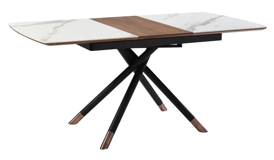 Rounded edges attain a soft silhouette, and the metal cross leg base brings a cool touch with the copper caps. This table can easily extend from 51” to 67” to comfortably seat up to six of your closest friends or family members.
