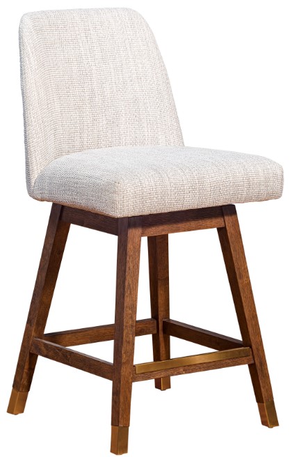 The Amalie counter or bar height stools feature a sturdy wood 4 leg base constructed from rubberwood. Rubberwood is a durable hardwood belonging to the maple family. Its dense grain character makes it a stable construction material that is naturally resistant to fungus and bacteria. The polyester upholstery really helps these wood bar stools stand out. The long-term durability of polyester makes it an ideal choice of stool upholstery fabric for families with children and pets. Polyester upholstery is water repellent, stain resistant, budget friendly, and less prone to discoloration. The soft upholstery of this swivel bar stool creates a convenient combination of comfort and function. The Amalie stool features grey or taupe options in boucle fabric. The fuzzy nature or bouclé means its pairs perfectly with curved or rounded pieces like asymmetrical sofas, armchairs, and of course the Amalie bar stool. The 180-degree memory swivel or ‘spin-back’ seat allows you to swivel either way and the seat always returns to forward facing position when you stand up. The Amalie stool is available in your choice of a 26 inch or 30 inch seat height and comes in a grey oak wood finish with boucle grey or mocha upholstery or a brown oak wood finish with boucle taupe or beige fabric upholstery.