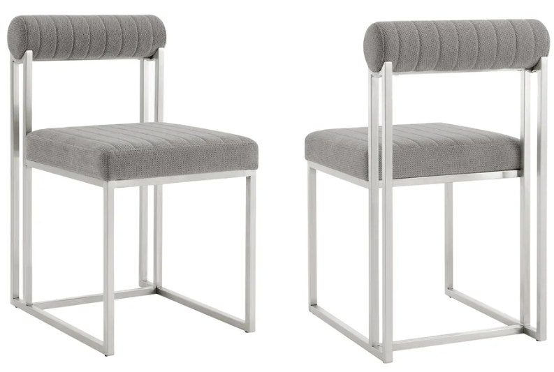 A cylindrical cushion is beautifully balanced upon its airy frame to offer comfortable back support. Its cushioned backrest and padded seat showcase a neat channeling detail that provides texture for a chic and inviting look. The chair is upholstered in performance fabric to offer easy care and maintenance. Its slender and clean-lined metallic frame reflects the refined and elevated tone of our chair. The contemporary Anastasia chair can add a dose of comfort and charm to your eat-in kitchen and dining room. With versatile styling potential, it can serve as an occasional chair to offer an easy and chic place to land anywhere from your lounge to your home office. Available as a set of two, the Anastasia Dining Chair comes in brushed stainless steel with Light Gray, Charcoal, Blue, or Taupe fabric or matte black iron with Anchor Gray fabric, Light Gray fabric, or Light Gray faux leather to bring style and comfort to your home.