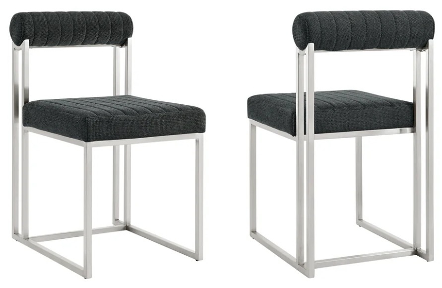A cylindrical cushion is beautifully balanced upon its airy frame to offer comfortable back support. Its cushioned backrest and padded seat showcase a neat channeling detail that provides texture for a chic and inviting look. The chair is upholstered in performance fabric to offer easy care and maintenance. Its slender and clean-lined metallic frame reflects the refined and elevated tone of our chair. The contemporary Anastasia chair can add a dose of comfort and charm to your eat-in kitchen and dining room. With versatile styling potential, it can serve as an occasional chair to offer an easy and chic place to land anywhere from your lounge to your home office. Available as a set of two, the Anastasia Dining Chair comes in brushed stainless steel with Light Gray, Charcoal, Blue, or Taupe fabric or matte black iron with Anchor Gray fabric, Light Gray fabric, or Light Gray faux leather to bring style and comfort to your home.
