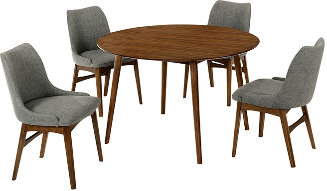 Hints of Scandinavian design and a mid-century modern feel come together to create the perfect space to share a meal with friends and family. With the 48” diameter table, you can easily pull up a few extra chairs and easily accommodate more guests. Round tables are great because they can accommodate the most people. The Azalea dining chairs feature soft fabric upholstery luxuriously wrapped around the entire seat - covering the ultra-comfortable foam padded cushion. Featuring a wide back and spacious seat, you never have to feel confined to a small space. The clean, sleek, and geometric wooden legs add a modern style to this chair - also assuring dependability that this chair will last and give you years of enjoyment. The Arcadia and Azalea 48" round 5-piece dining set is available in your choice of a black wood finish with grey upholstered chairs or a walnut wood finish with blue, charcoal or orange upholstered chairs.