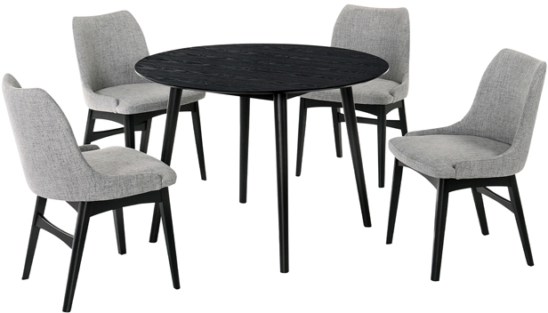 Hints of Scandinavian design and a mid-century modern feel come together to create the perfect space to share a meal with friends and family. Round tables are great because they can accommodate the most people. It’s easy to squeeze in an extra table setting or two where there aren’t any corners! The Azalea dining chairs feature soft fabric upholstery luxuriously wrapped around the entire seat - covering the ultra-comfortable foam padded cushion. Featuring a wide back and spacious seat, you never have to feel confined to a small space. The clean, sleek, and geometric wooden legs add a modern style to this chair - also assuring dependability that this chair will last and give you years of enjoyment. The Arcadia and Azalea 42" round 5-piece dining set is available in your choice of a black wood finish with grey upholstered chairs or a walnut wood finish with blue, charcoal or orange upholstered chairs.
