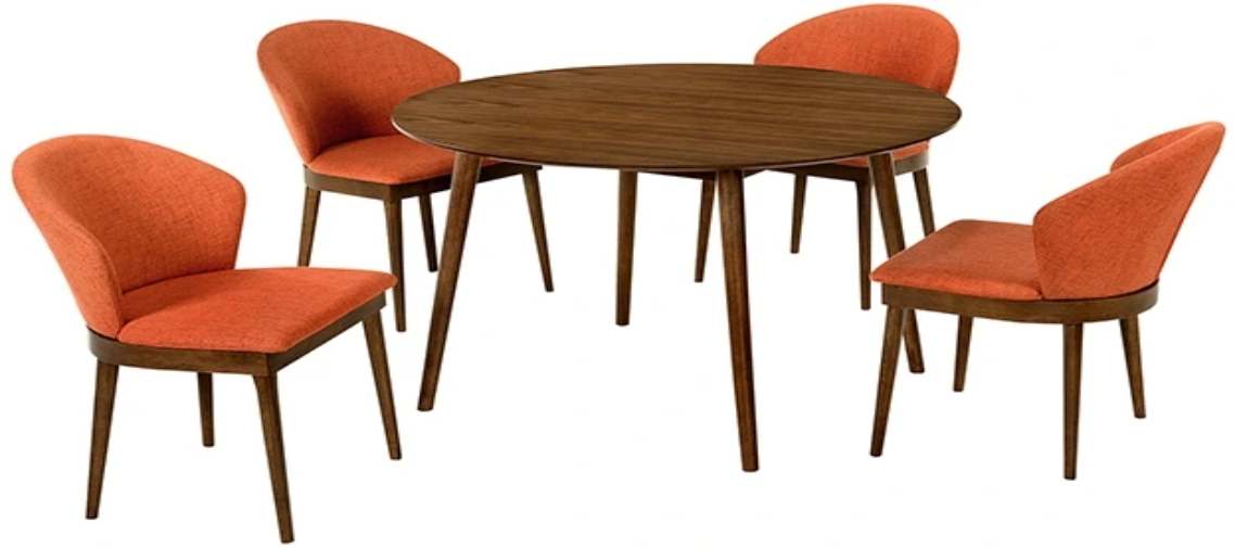 Meticulous craftsmanship and expert design have gone into the creation of this dining set, which is as functional as it is stylish. Hints of scandinavian design and a mid-century modern feel come together to create the perfect space to share a meal with friends and family. Round tables are great because they can accommodate the most people. It's easy to squeeze in an extra table setting or two where there aren't any corners! The tall, rounded seat back of the juno chair features ergonomic properties to keep your back healthy and properly aligned. The soft fabric upholstery is wrapped around an incredibly comfortable foam padded seat cushion for your pleasure. The arcadia and juno 48" round 5 piece dining set is available in your choice of a black wood finished table with charcoal upholstered chairs, or a walnut wood finished table with charcoal, orange, or blue upholstered chairs.