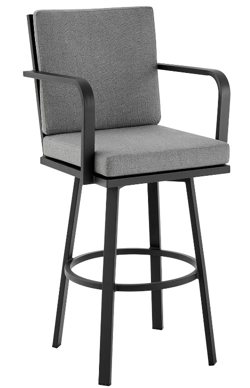 The strong aluminum frame is resistant to rust and it's 360-degree swivel functionality allows for optimal mobility. The Arnauld features a sturdy 4 leg base and its ring footrest gives additional comfort for extended seating periods. The back and seat cushions are upholstered from polyester and have a convenient zipper closure that makes clean up a breeze! Polyester is strong, flexible and resists water damage and staining. It's tear-resistant and dries quickly. Minimal maintenance is required for the stool frame. Often, using a typical garden hose to rinse off the patio furniture will do. For more stubborn residue, a little warm water and soap will usually suffice. The Arnauld outdoor patio bar stool in aluminum with cushions is available in a black aluminum finish with grey cushions or a brown aluminum finish with brown cushions.