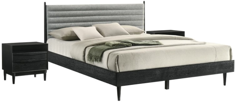 The upholstered headboard features a neat and elegant channel tufting detail to bring style and character to your bedroom or guest room. It includes slim track arms and is perched upon slender legs to make any room feel open and airy. Our versatile platform bedframe can be used with most types of mattresses, including innerspring, memory foam, hybrid, and latex. Our nightstands and dresser feature a refined and functional design that beautifully highlights the rich textures of wood. Their minimalistic silhouette is complemented with linear undercut drawer pulls to serve as a stunning design detail. The nightstand features two roomy drawers and a shelf, the dresser has 6 drawers, and both are perfect for keeping your essentials organized and within easy reach. Bringing effortless charm and character to your home, this bedroom set seamlessly blend and complements any style or decor. The Artemio 4-piece bedroom set includes 1 king or queen size bed, and 2 nightstands, and 1 six drawer dresser. It is available in a rich walnut or sleek black finish.