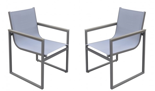 The Armen Living Bistro outdoor patio dining chair is an exceptional piece certain to fit your outdoor seating needs. Lightweight and durable, the Bistro's grey powder coated finish aluminum frame allows for ease of rearrangement without compromising on quality or aesthetics. The Bistro's grey sling textilene seat and back are water proof and provide an ideal amount of comfort and support. The Bistro's arms feature grey wood accents that enhance the appearance of this already stylish patio chair. The Bistro comes in grey and is sold in a set of two.Read More