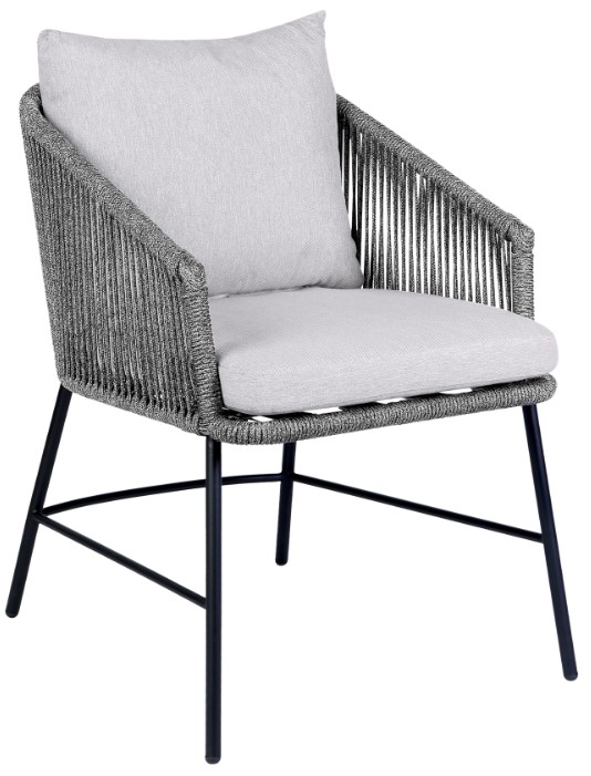 This patio chair sits upon slender black steel legs to serve as a sleek and stylish addition. Steel does not dent or get bent out of shape as easily as some aluminum furnishings can. Lighter than wrought iron but heavier than aluminum, steel provides strength, stability, and endurance in extreme temperatures. Featuring a comfy cushion and a boxy seat, our outdoor dining chair effortlessly combines style and comfort, while the zipper closure allows you to remove the cushion covers for easy cleaning! Moisture and water are ongoing concerns for outdoor furniture. Even if your outdoor furniture stays out of the rain, condensation is likely going to build up on the furniture regularly. Polyester is not permeated easily by water. Secondly, polyester resists the types of molds and mildews that will take root in fabrics made of natural fibers. This means the patio furniture will have a longer life with polyester upholstery. Looking fresh in all seasons, our durable outdoor dining chair remains the perfect complement to your patio, backyard, or balcony. This patio chair conveniently ships fully assembled and can be used right after unpackaging. The Calica outdoor dining chair features a grey rope weave, durable black steel legs, and grey upholstery on the cushions.