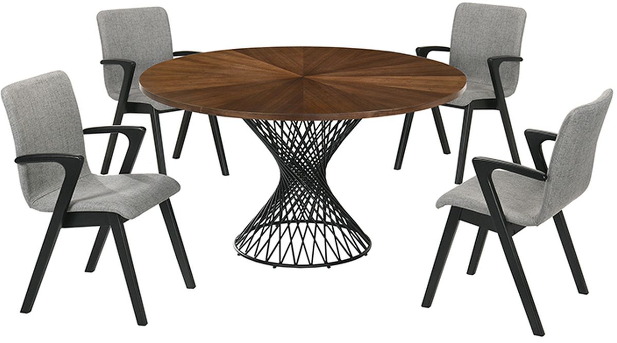 The Armen Living Cirque and Varde mid-century dining set promises an unmatched degree of comfort and dependability, making it an ideal choice for the contemporary dining room. The Cirque's modern design boasts a black intricate pedestal metal base, brilliantly complemented by the table's stylish Black Veneer round top design. This combination finds its ideal match in the Varde’s sleek black frame. Foam padded and exceptionally comfortable, the Varde offers a supportive frame wrapped in a sophisticated grey fabric package. The Cirque/Varde combination is designed to fit in any dining room but features a versatile appearance that makes it perfect for just about any room of the house. The Cirque/Varde set comes with 1 dining table and 4 dining chairs.