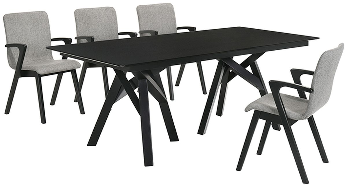 The Armen Living Cortina and Varde mid-century dining set boasts an ideal combination of comfort and style that is certain to make every family gathering relaxing and memorable. The Cortina's Black Veneer frame and beautiful top are complemented beautifully by the Varde's stylish grey upholstery and sleek construction. The Varde's back cushion accents and overall tall back design make the side chair not only appealing to the eye, but perfectly supportive as well. The Cortina/Varde combination is designed to complement any mid-century dining room decor but features a versatility that makes it work well in just about any room of the house. The Cortina/Varde set comes with 1 dining table and 4 dining chairs.