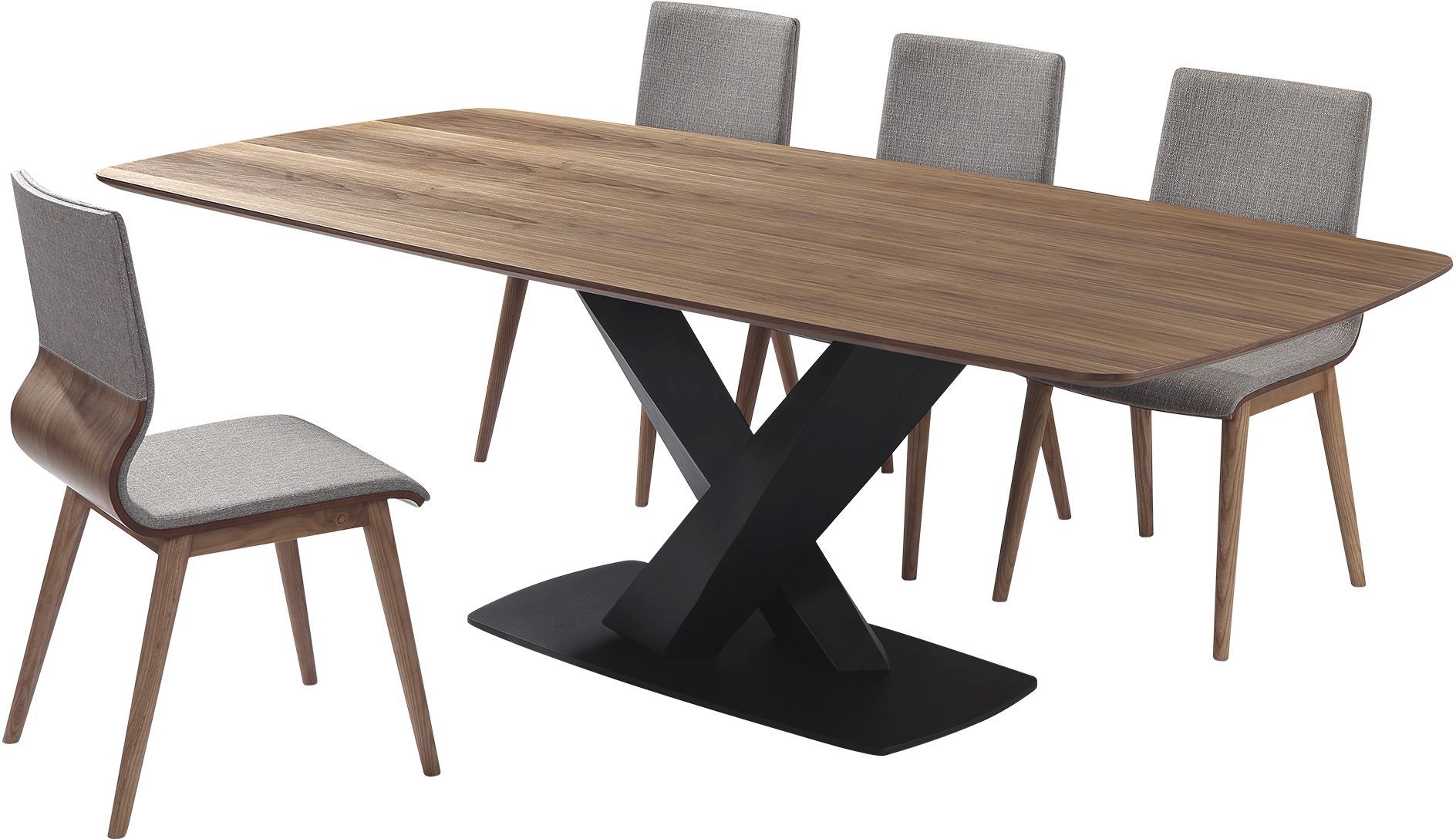 The Armen Living Everett and Robin mid-century dining set promises an unmatched degree of comfort and dependability, making it an ideal choice for the contemporary dining room. The Everett's modern design boasts a Matte Black Finish metal frame, brilliantly complemented by the table's stylish Walnut Veneer top design. This combination finds its ideal match in the Robin's sleek walnut frame. Foam padded and exceptionally comfortable, the Robin offers a supportive frame wrapped in a sophisticated grey fabric package. The Everett/Robin combination is designed to fit in any dining room, but features a versatile appearance that makes it perfect for just about any room of the house. The Everett/Robin set comes with 1 dining table and 4 dining chairs.