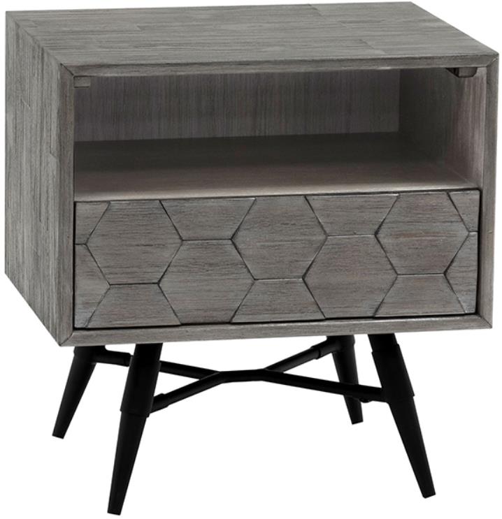 Add sleek style to your bedside with our Makena one-drawer nightstand in grey Acacia wood. The modern and streamlined silhouette of the nightstand is enlivened with a geometric honeycomb pattern. Featuring a sleek grey finish, it beautifully showcases the rich grains of Acacia.Read More