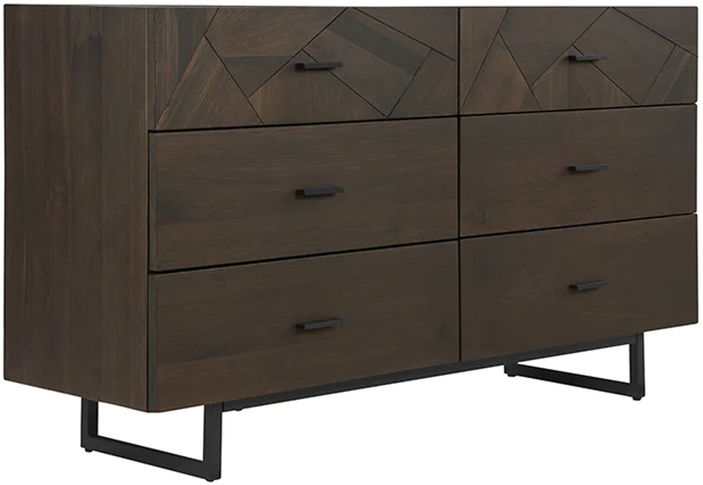 Unlike other hardwood materials, oak wood furniture requires minimal maintenance. Because it is a dense wood, it does not scratch or stain easily. Thus, you can keep it looking brand-new, like when you first purchased it. All you need to do is dust it and apply furniture wax at least every six to nine months. The top drawers feature wood pieces cut and placed various angles to attain a lively and geometric façade. With a smoke oak finish and sleek metallic handles, the dresser lends an air of elegance and charm. Simple and versatile, the dresser invites natural warmth and elegance to your bedroom, but can be used for storage in your entryway, home office, or living room. Use a dresser as a console table placed at the back of your sofa; use a dresser that's either the same height or lower than your sofa's back. Create a more functional foyer with a dresser to hold seasonal items such as gloves and scarves while placing keys and mail on top. It is elevated upon black metallic legs to attain a light and airy look. Lending style and convenience, the dresser features six roomy drawers to keep all your linens and clothing organized. Product Dimensions: 18" L x 60" W x 34" H