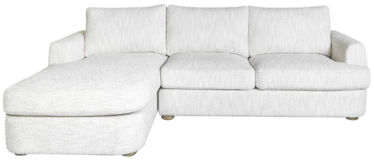 The generously sized rectangular seat comfortably accommodates up to three people, perfect for lounging, reading, or movie nights with friends and family. Designed with a plush pillow-back for exceptional support, the Reid invites you to relax in total comfort. Rounded, foam-padded arms create a cozy yet refined silhouette, adding softness and sophistication to any space. Built for lasting use, the frame is constructed from a durable mix of engineered wood and solid rubberwood, supporting up to 1,200 pounds with ease. The sectional rests on a classic four-leg base in a warm brown finish that complements the upholstery beautifully. Available in both Left Arm Facing and Right Arm Facing configurations, the Reid Sectional adapts effortlessly to your layout, offering flexible styling options for the modern.