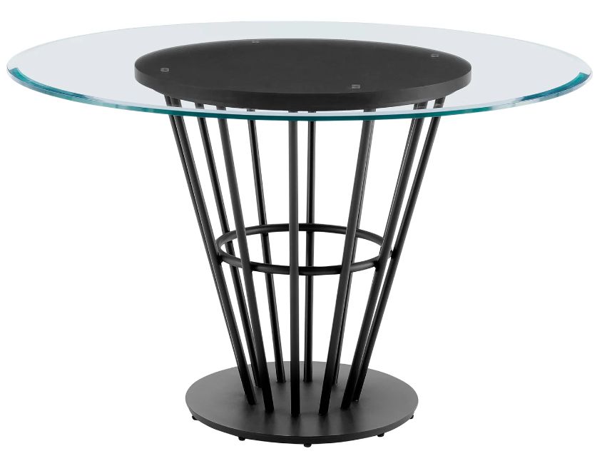 Its glass tabletop is rests on a round walnut veneer panel for a beautiful contrast of materials. The conical base achieves a sleek and airy presence within its metallic detailing. The Veronica dining table serves as a stunning centerpiece for your kitchen, dining, or living space, and its round shape creates a natural hub for inclusive conversations and activities. With a diameter of 48", this dining table can comfortably seat up to 4 people. It offers plenty of aesthetic appeal and comfort to your intimate dinners and family gatherings. This dining table is constructed with high-quality materials and craftsmanship to offer style and functionality for years to come. The Veronica Round Dining Table is available in a Glass tabletop and Walnut Panel with a Black Iron, Brushed Stainless Steel, or Gold Stainless Steel base to effortlessly complement your home.