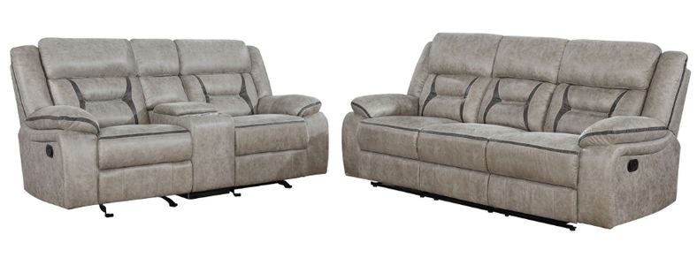 The Coaster® Greer Motion Sofa features 98% Polyester and 2% Polyurethane fabric in Taupe color, drop down table with two cup holders, pocket for storage, USB ports, and two outlets.