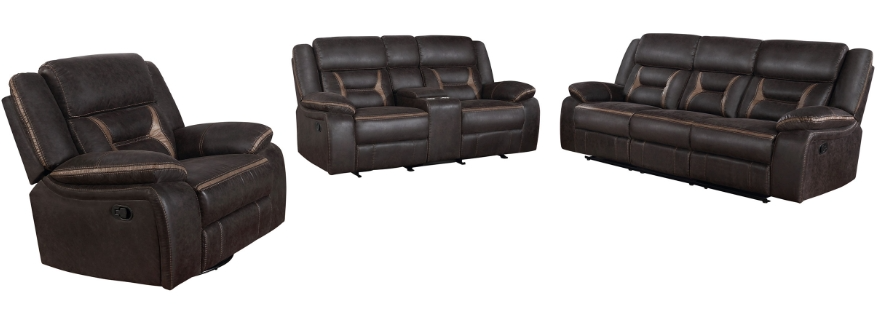 The Coaster® Greer Glider Loveseat with Console features 98% Polyester and 2% Polyurethane fabric in Brown color. This loveseat has a console that features two cup holders, storage space with two outlets and one USB port.