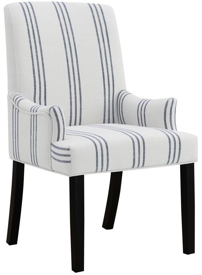 Dining armchair upholstered in beige linen-like fabric with blue stripes for a casual, refined look