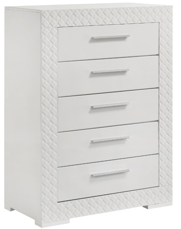 Organize your wardrobe in style with this contemporary chest. The high gloss finish and 3-dimensional diamond tile emboss provide a chic, modern look that enhances any bedroom decor. Five spacious drawers offer ample storage for clothing and linens, each with felt lining in the top drawers to protect your items.Read More