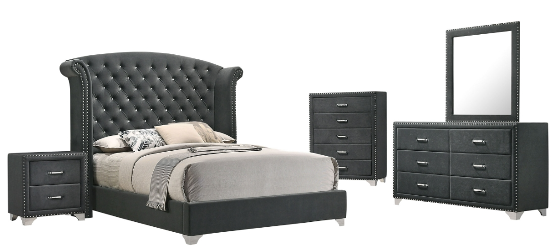 Accent your sleeping space like never before with this 5-piece bedroom set. A dramatically large wingback headboard towers over the bed to make a grand display, featuring button tufting and nail head trim. A matching dresser comes equipped with 6 spacious drawers with nail head trim around the frame, coordinating with the matching mirror and 5-drawer chest.Read More