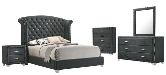 Bedroom set includes tufted bed and coordinating velvet-upholstered storage