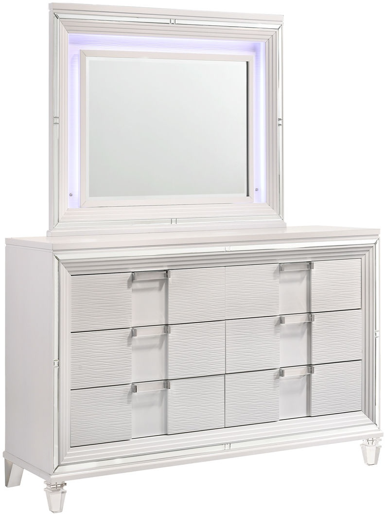 The mirror features an LED mood lighting, creating the ideal ambience for your bedroom. Along the front is a mirror glass trim, adding extra flair to this already stylish piece. The clear, acrylic drawer handles and feet are the perfect finishing touches to this dresser that will instantly become a bedroom staple for years to come!