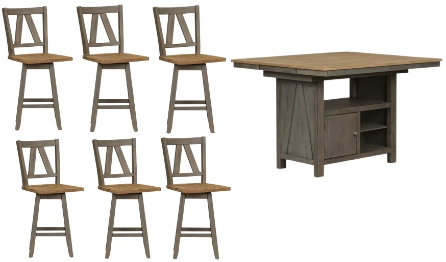 Wow family and friends with the Lindsey Farm seven-piece gathering table set. Crafted of rubberwood solids and veneers, this set features a gray and sandstone finish and consists of the kitchen island table and six counter height swivel chairs.Read More