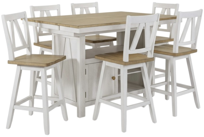 Wow family and friends with the Lindsey Farm seven-piece gathering table set. Crafted of rubberwood solids and veneers, this set features a weathered white and sandstone finish and consists of the kitchen island table and six counter height swivel chairs.Read More
