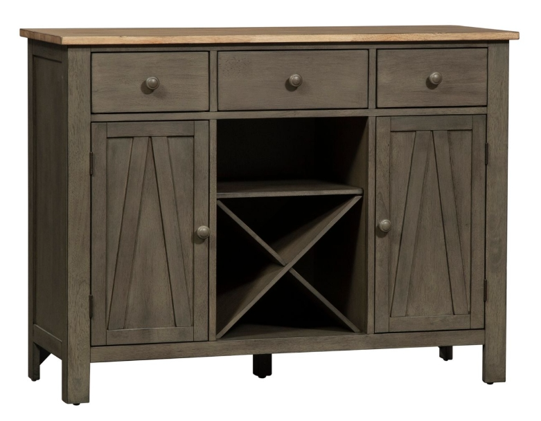 This server has three drawers accented with gray wood knob hardware, one adjustable shelf behind each door, and removeable x shaped wine shelving. This piece has an alternate finish and offers a look that compliments today's homes with style uncompromised.