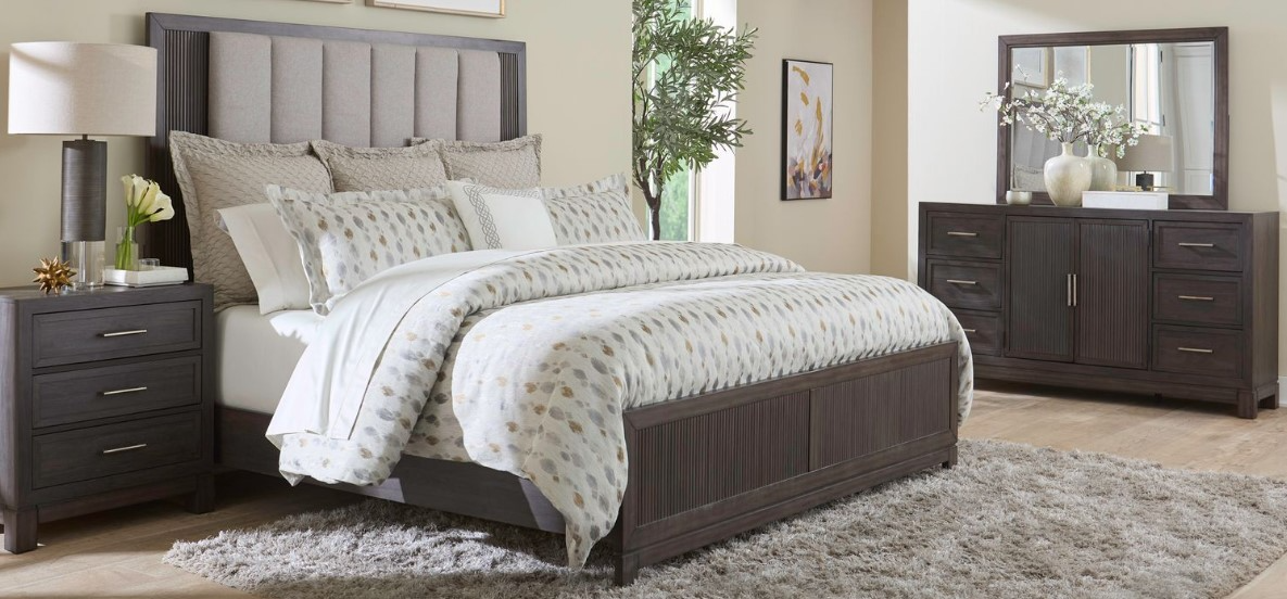 The Modern Edge king upholstered bed, dresser, mirror, and nightstand is a harmonious blend of classic elegance and contemporary flair, adding a touch of sophistication to your sleep space. Crafted with excellence using Rubberwood solids and Melamine, this set features a Caffe finish.Read More