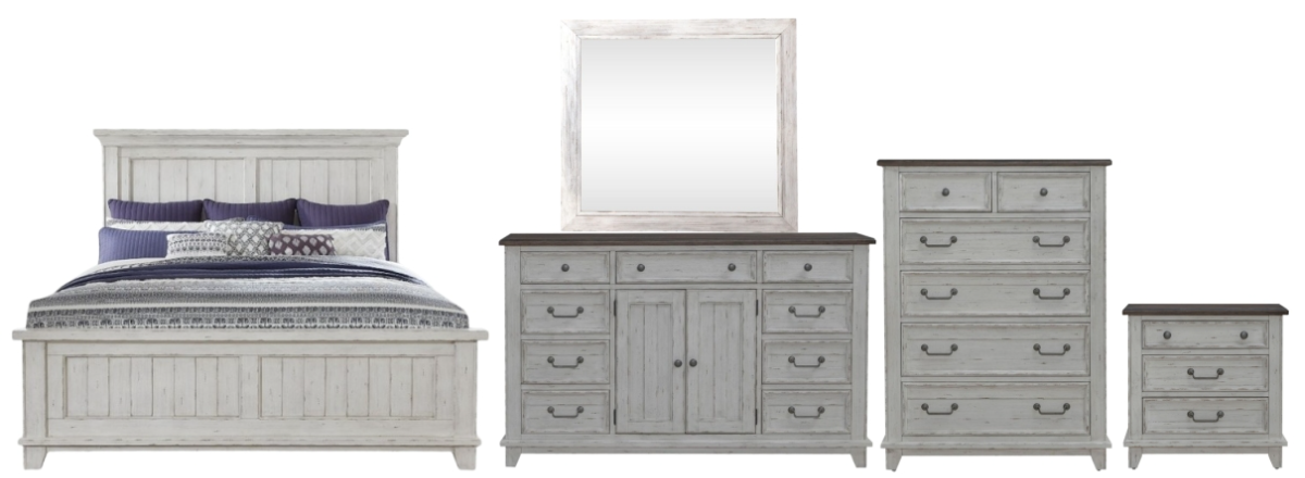 Create a room of your own that provides the perfect start and end to every day with the River Place king panel bed, dresser, mirror, chest, and nightstand. Crafted with excellence using Pine solids and veneers, this set features a heavily distressed two-tone Riverstone White and Tobacco finish.Read More