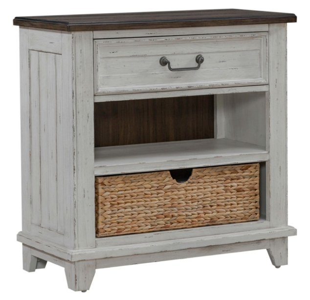 Create a room of your own that provides the perfect start and end to every day with the River Place bedside chest with charging station. Crafted with excellence using Pine solids and veneers, this bedside chest features a heavily distressed two-tone Riverstone White with Tobacco top finish.Read More