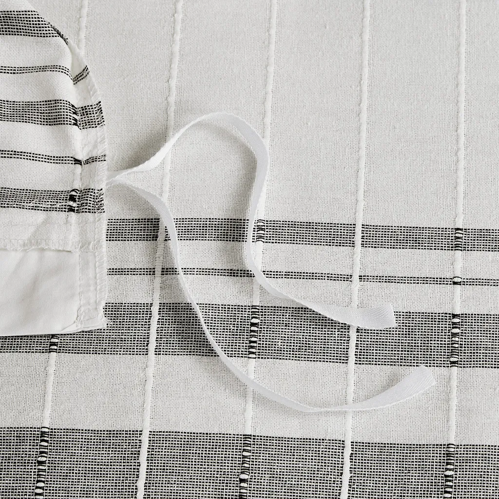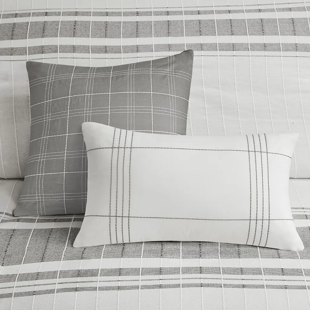 Introduce an upscale cottage charm to your bedroom with the Harbor House Morgan 5 Piece Cotton Duvet Cover Set. This 100% cotton jacquard duvet cover features textured vertical woven stripes with contrasting horizontal blue stripes on white ground, for a modest farmhouse look. The duvet cover comes with button closures and 4 inner ties to prevent any shifting (insert not included). Included are 1 square and 1 oblong decorative pillow adding textural layers to your bed. The polyester pillow filling is also hypoallergenic, meaning it contains no allergens and is dustproof, so you can sleep comfortably. This duvet cover is also OEKO-TEX certified, meaning it does not contain any harmful substances or chemicals to ensure quality comfort. Machine washable for easy care, steam iron for wrinkle removal.